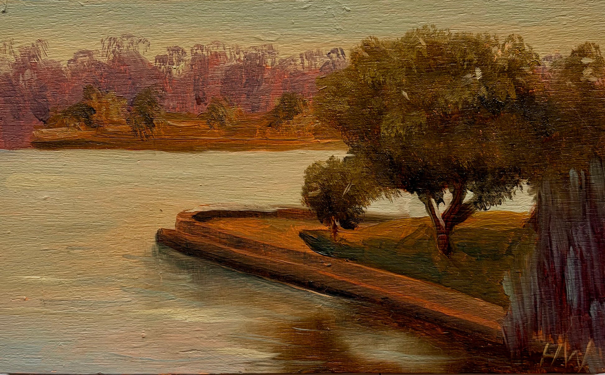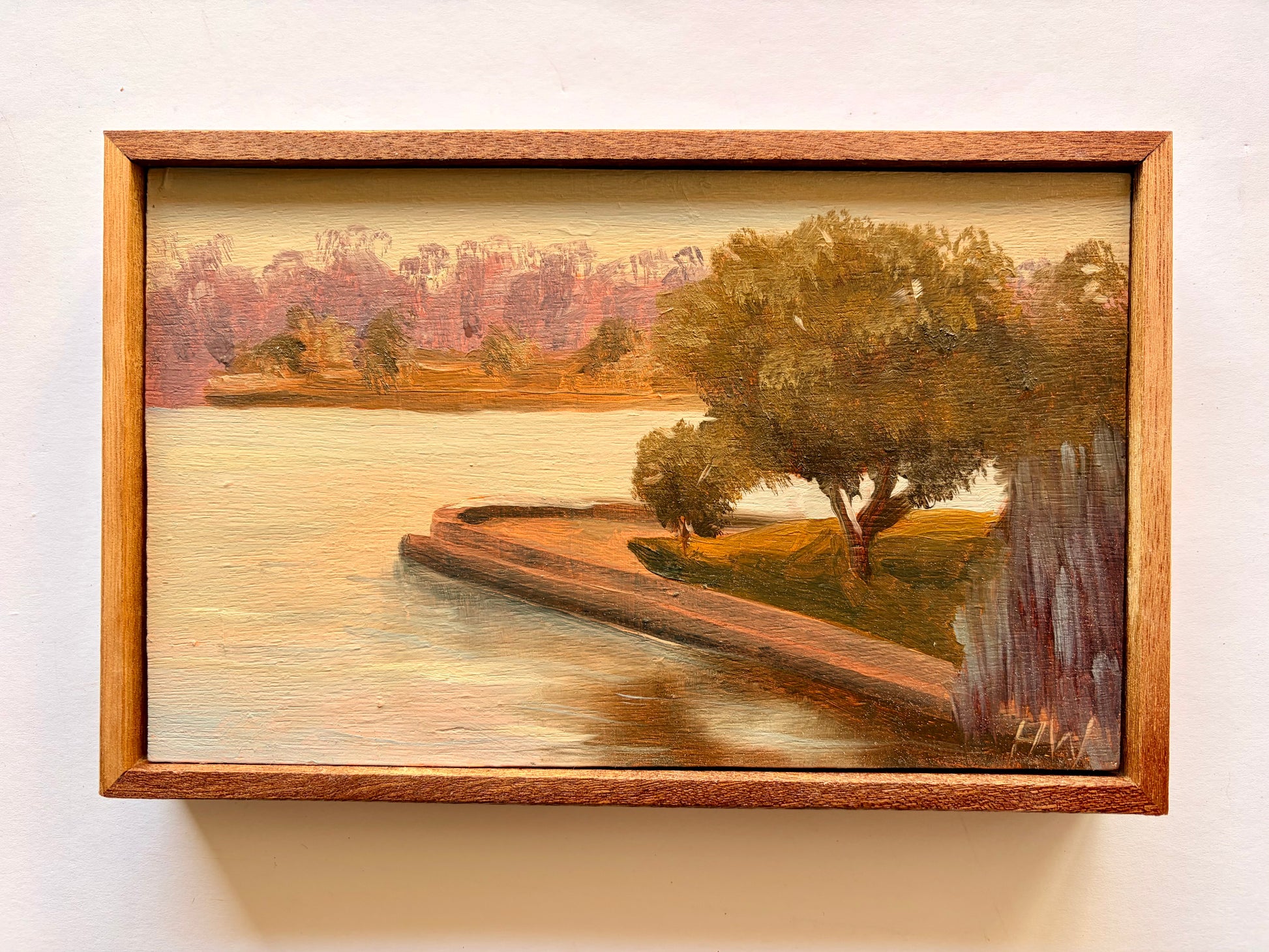 Painted en plein air from the hill above Birkenhead Point, this work captures the suspended quiet before sunrise. The sun had not yet lifted over the ridge, leaving the harbour in muted tones of mauve, ochre, and softened blue. The headland curves gently into still water, its trees held in silhouette against a sky preparing for light. Working in the cool hush of early morning, I focused on the subtle shifts in value rather than colour, allowing form and atmosphere to lead. The painting reflects anticipation, that fleeting interval when land and water wait, poised for the day to begin.