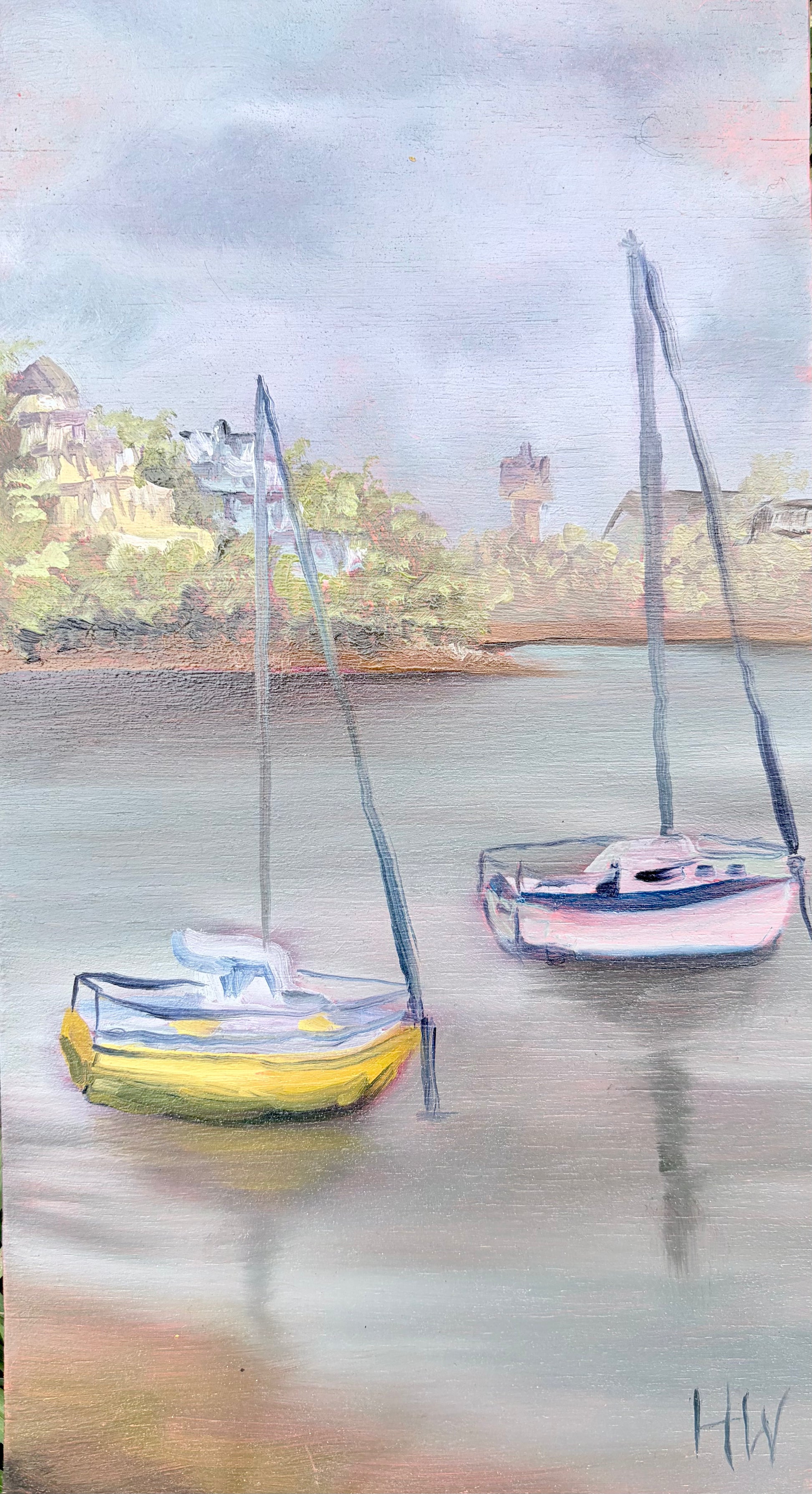 Two lonely boats sitting in the rain on the Parramatta River, just waiting for a sunny day sail. Oil paint on wooden board approx 14cm x 24cm